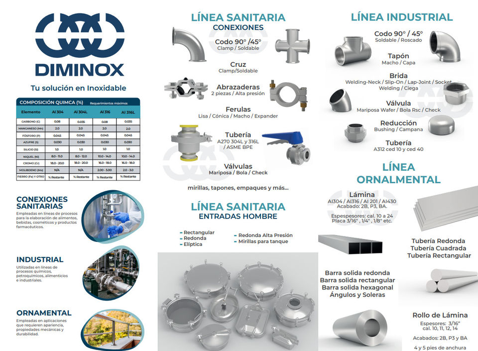 Diminox es una empresa 100% mexicana, proveedora de conexiones, materiales y tubería en acero inoxidable para aplicaciones: sanitarias, industriales y ornamentales.